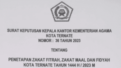 TERNATE – Kementerian Agama (Kemenag) Kota Ternate menerbitkan Surat Keputusan (SK) Nomor : 36 Tahun 2023, tentang Penetapan Zakat Fitrah, Zakat Mal dan Fidyah Kota Ternate Tahun 1444 H/2023 M.