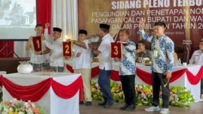 Sementara di Kabupaten Halmahera Tengah (Halteng), Senin (23/9/2024) rapat Pleno terbuka pengundian dan penetapan nomor urut pasangan calon Bupati dan Wakil Bupati Kabupaten Halmahera Tengah dalam pemilihan serentak 2024.