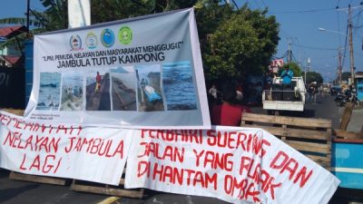 Pantauan di lokasi, aksi blokade jalan dilakukan warga dengan cara membentangkan spanduk bertuliskan tuntutan masyarakat. Tidak hanya itu sejumlah perahu nelayan setempat juga difungsikan sebagai alat pemblokiran akses jalan utama.