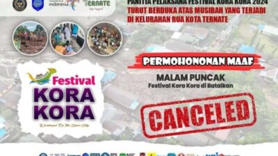 Kabar27 – Panitia Pelaksana Festival Kora Kora 2024 mengkonfirmasi acara malam puncak konser musik festival Kora Kora 2024 Kota Ternate yang sedianya digelar Minggu (25/8/2024) malam nanti, dibatalkan.